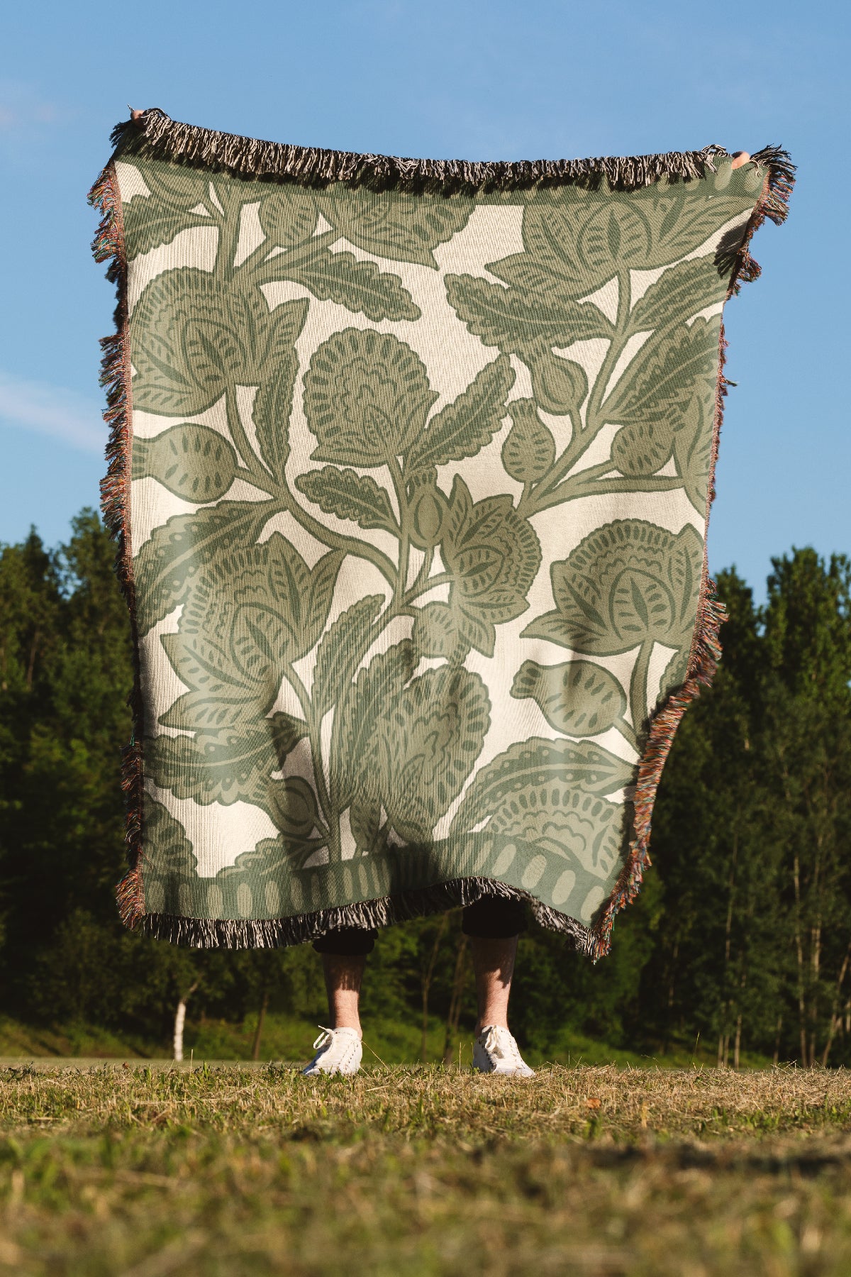 The Peony Throw Jacquard Woven Blanket (Off-White & Green)